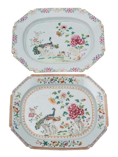 Two Chinese famille rose 'Double Peacock' pattern octagonal meat dishes: each painted with a peacock and peahen perched on rockwork amongst peonies and other flower sprays, Qianlong, 41 and 43cm [one with minor rim chips].