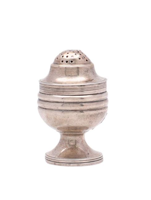 A George III pepperette, maker Peter and William Bateman, London, 1809: of urn-shaped outline, with domed lift-off lid, raised on a circular foot, 7cm high, 45gms, 1.47ozs