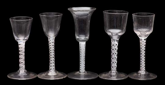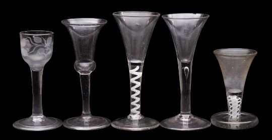 A group of ten English and Dutch wine glasses, 18th Century and later: including a cordial glass with moulded lower bowl and opaque twist stem, 15cm; a small wineglass with engraved ogee bowl, on folded foot, 14cm; a firing glass and seven various wineglasses [some footrim chips] 10.