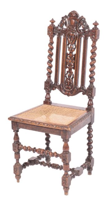 A carved oak and canework chair in Charles II style, late 19th century,: the openwork backrest with foliate carved cresting and centre splat, flanked by channeled splats and spiral turned sides; the caned seat above baluster and spiral turned legs and stretchers; 111cm high, 47cm wide
