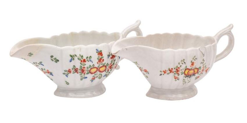 A matched pair of Plymouth polychrome fluted sauceboats: painted with chrysanthemum and other floral sprays, one with alchemist mark, circa 1768-70, 20cm. (one with damage and repair, the other with rim chips).