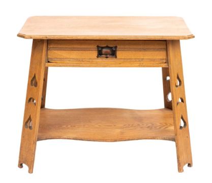 An oak side table in Arts and Crafts style, circa 1900,: the rectangular top with canted corners and moulded edges; above a frieze drawer with brass swing handle; the four canted plank legs with pierced heart and crescent motifs, united by an undershelf with serpentine edges; 72cm high, 92cm wide, 55cm deep overall