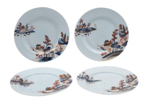 A set of four Chinese plates: each painted in the Imari palette in underglaze blue, iron-red and gilt with a pagoda and other buildings in lakeside vignettes, Qianlong, 23cm (minor fritting, hair crack to one).