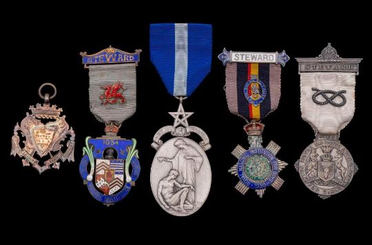 A collection of two silver and enamel and three silver Masonic jewels: some boxed.