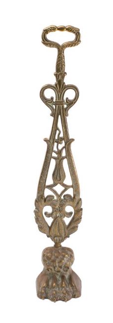 A brass door porter: of lyre-shaped outline, with loop carrying handle and raised on a lion's paw foot, 56cm high.