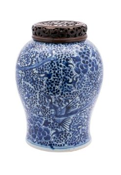 A Chinese blue and white baluster jar and one other: painted with phoenix amongst berries and peony blooms, double circle mark, Kangxi/early Qianlong,, 34cm. (rim restored) and carved and pierced wood cover; and a prunus pattern rouleau vase (cut down), 40cm. and cover.