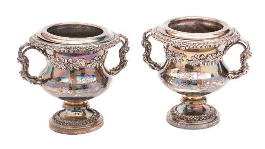 A pair of late 19th century silver plated wine coolers: of campagna form with cast oak leaf and acorn banded decoration, having naturalistic branch handles to the sides, raised on circular weighted bases, with inner liners and rims, 25cm high.