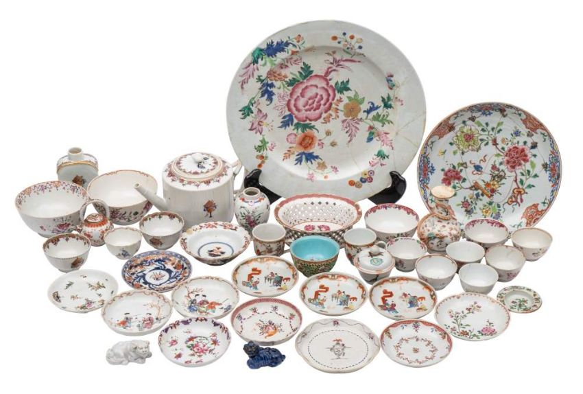 A mixed lot of Chinese and Japanese famille rose porcelain, 18th/19th century: including a teapot and cover with matching teapoy and two teabowls painted with classical urns, late Qianlong/Jiaqing; two dishes, various tea wares etc [approx. 34 pieces] damages.