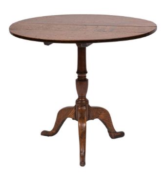 A George III oak circular occasional table, circa 1770,: the circular flip top on a turned shaft with urn moulding; on three splayed legs to pad feet; 71cm high, 81cm diameter