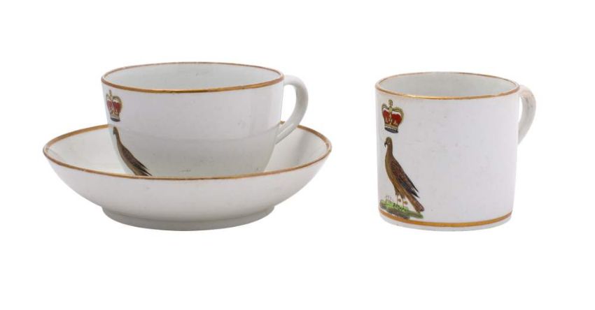 An early 19th century English porcelain armorial trio: the tea cup of Bute shape, painted with the crest of a crowned hawk perched on a green mound, saucer 13cm [minor wear to gilt].