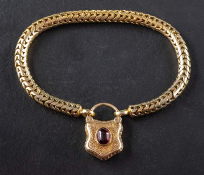A snake-link bracelet with an engraved cartouche locket clasp,: the clasp with a cabachon-cut garnet and glazed compartment to verso, length ca. 18.5cm, total weight ca. 20.6gms.