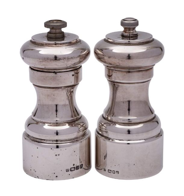 A pair of Elizabeth II silver salt and pepper mills, maker David Shaw Silverware Ltd, London, 1988/89 : of traditional design each 11.5cm high.