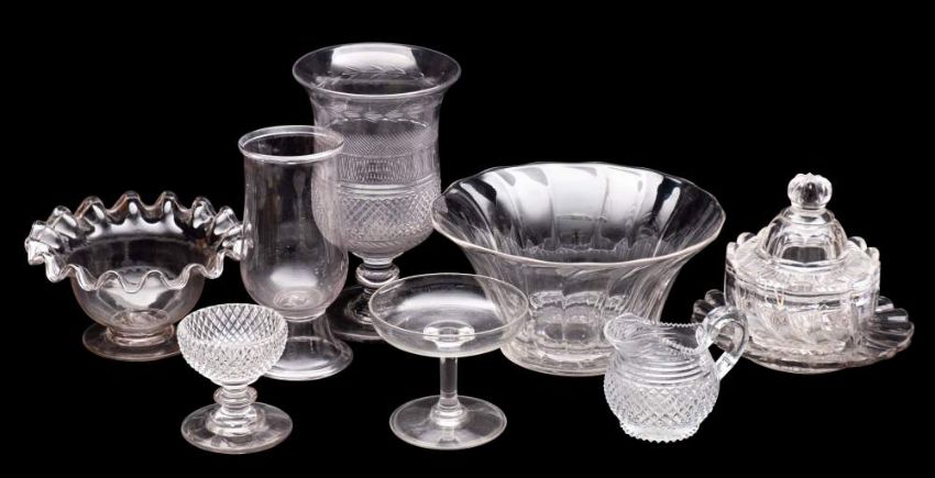 A mixed group of glassware: comprising a wrythen lobed and cut confiture, cover and stand, a footed bowl with crimped fold over rim, a fluted footed bowl, a low comport, a lantern together with a hobnail cut jug, pedestal salt and a celery vase, early 19th century and later, the latter 23cm high.