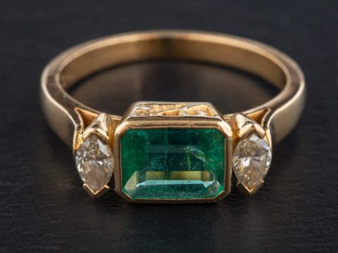 A three-stone, emerald and marquise-cut diamond ring,: calculated weight of emerald ca. 1.05cts, estimated total diamond weight ca. 0.30cts, colour tinted, clarity SI2-P1, length of ring head ca. 1.3cms, ring size N, total weight ca. 4.4gms. 'The property of the late Ann Meyrick'
