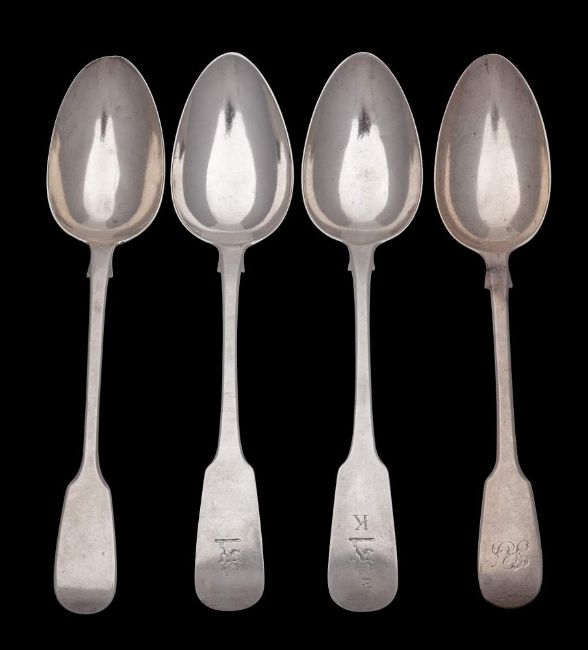 A pair of George IV silver Fiddle pattern tablespoons, maker Patrick Moore, Dublin, 1820: crested, together with two other Fiddle pattern tablespoons initialled, total weight of silver 288gms, 9.26ozs. (4).