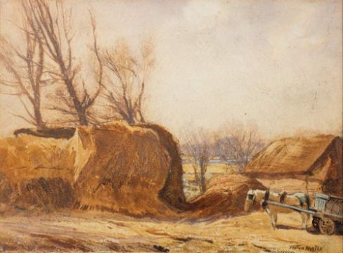Sir George Clausen [1852-1944]-Landscape sketch,:- signed bottom rightchalk drawing, ink and wash on paper, 24 x 30cm, together with three watercolours by William Tatton Winter [1855-1928] of a South Downs Mill, signed and dated 1910, 35 x 39cm, a Horse, Cart and Hayricks, signed, 26 x 36cm, Cothertstone Mill, Yorkshire, signed bottom right, 32 x 29cm, with one other of Horse and Wagon on the brow of a hill. [5]Please see website for further images of this lot www.bhandl.co.uk
