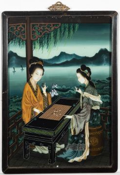 A pair of Chinese reverse painted pictures: depicting Chinese beauties playing a board game and another of a female with a bird, contained in ebonised frames, 65 x 44cm.