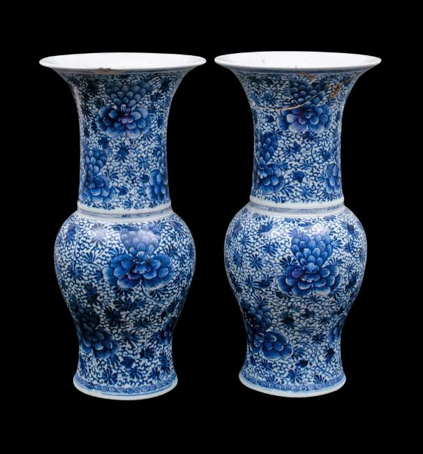 A pair of Chinese blue and white yen yen vases: each painted overall with large peony blooms and scrolling foliage and tendrils, double circle marks, late Kangxi/Qianlong, 45cm [one with damage to rim, the other with two glued sections).