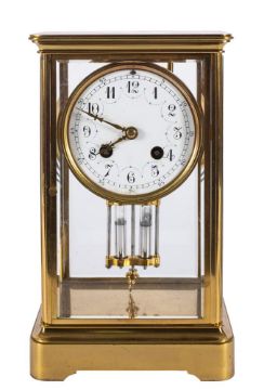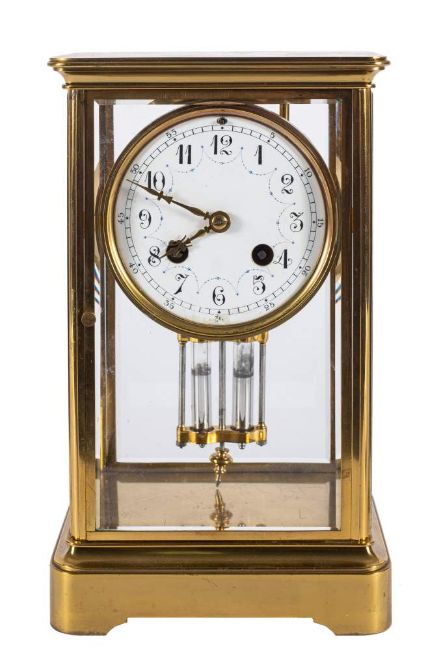 Japy Frères, a French brass four-glass mantel clock: the eight-day duration movement having a twin mercury pendulum bob and striking the hours and half-hours on a gong with the backplate stamped and numbered for the maker Japy Frères 3268, the white enamel dial having black Arabic numerals between decorative blue swags and brass fleur-de-lys hands, with a brass Corniche case, height 25cm. * For details of Japy Frères see lot no. 1795