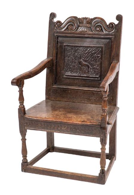 A Charles I oak wainscot chair, second quarter 17th century,: the backrest with toprail carved with a central wheatsheaf flanked by scrollwork; above a panel back with giraffe carved in low relief; the arms with scrolled terminals and knop turned supports; on conforming front legs and through stile back legs, with peripheral low stretcher; 101cm high, 62cm wide