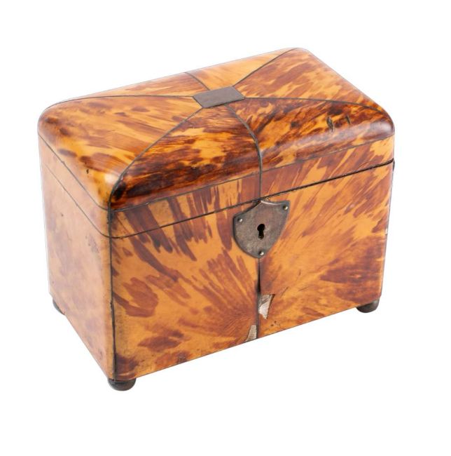 A 19th century blonde tortoiseshell tea caddy: of rectangular outline, the shallow domed hinged lid enclosing two lidded compartments, raised on ball feet, 18cm wide,
