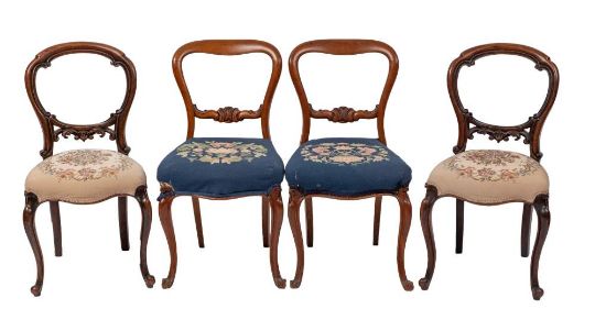 A pair of Victorian carved mahogany 'balloon back' side chairs, circa 1870,: the backrests with horizontal foliate carved splats; above later upholstered seats, on cabriole front and splayed back legs: 87cm high, 45cm wide; and a pair of Victorian oak 'balloon back' side chairs, circa 1870