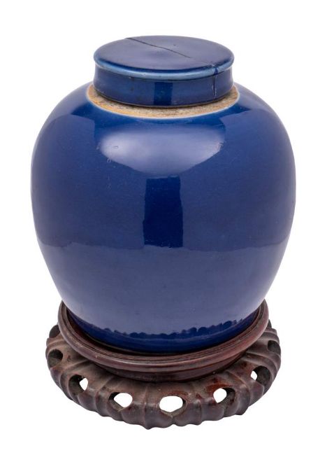 A Chinese powder blue ovoid jar and cover: Qing dynasty, 23cm (cover damaged) and wood stand.