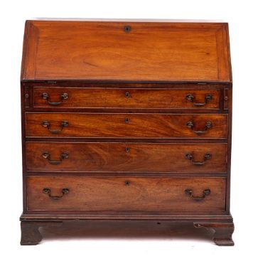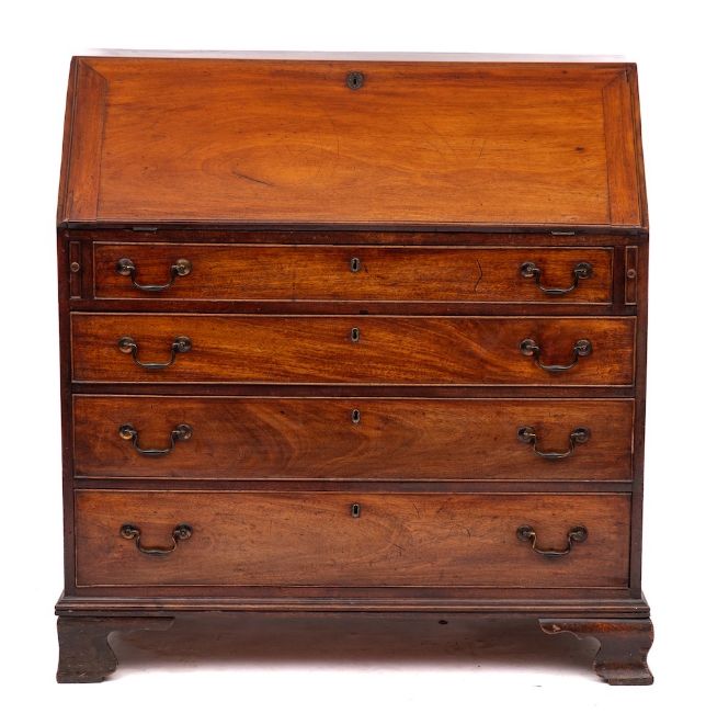 A George III mahogany bureau, circa 1780,: the fall front opening to a fitted interior with marquetry worked doors, drawers and pigeonholes; above twin lopers and four graduated drawers, all with twin brass swing handles and cockbeaded edging; on ogee bracket feet; 99cm high, 103cm wide, 57cm deep