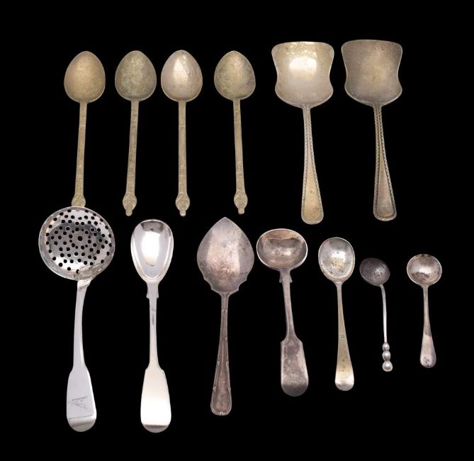 A small collection of silver and plated flatware: includes silver sifting spoon, mustard spoon and two salt spoons, weighable silver 42gms, 1.36ozs