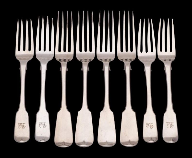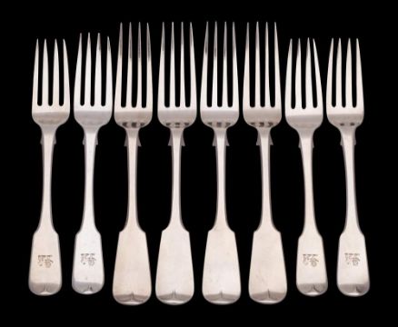 Four William IV provincial silver Fiddle pattern dessert forks, maker Thomas Byne, Exeter, 1835: initialled, together with a set of four similar forks by John Stone, Exeter, 1835, total weight of silver 414gms, 13.32ozs (8).