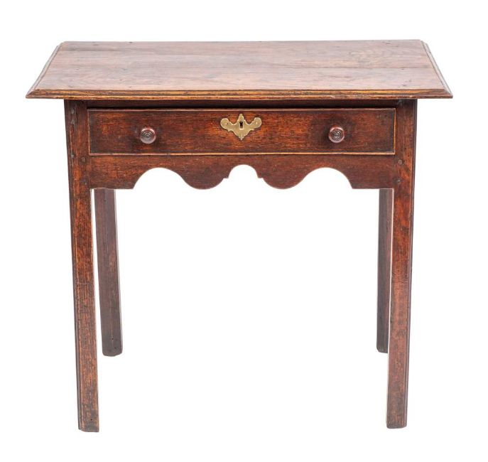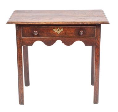 A George II oak side table, circa 1740,; the rectangular top with moulded front and side edges; the cockbeaded frieze drawer with twin turned knob handles, above a serpentine apron, the straight legs with chamfered inner edges; 73cm high, 82cm wide, 49cm deep Provenance: Purchased by the current vendor at Domani, Exeter on 22nd December 2007. The original invoice is available with the lot.