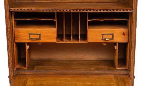 An Arts & Crafts oak and chequer banded upright bureau, circa 1900,: the three-quarter gallery top with twin spherical finials above two shelves and a fall front secretaire; above a panel fronted Canterbury rack; onsplayed front legs; 180cm high, 78cm wide, 32cm deep