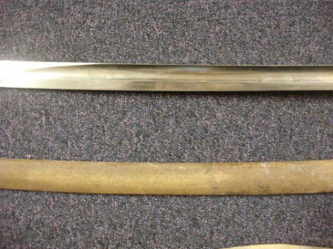 A late 19th/early 20th century cavalry sword by sword by Wyersberg. Kirschbaum & Co, Solingen: the slightlly curved blade stamped with broad arrow and 'WD' cipher and as per title, over a half basket hilt with two piece chequered grip, in a steel scabbard, blade length 87cm