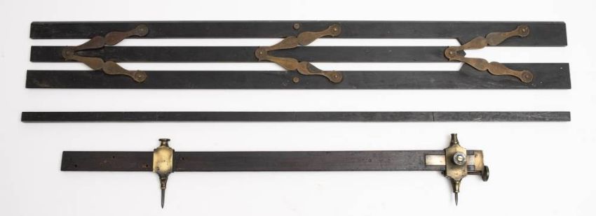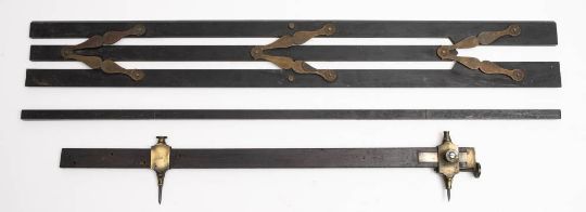 An early 19th century 32 1/4 inch ebony and brass parallel rule: unsigned, with brass 'moustache' fittings, together with an ebony and brass trammel, unsigned, with rack and pinion fine adjustment to one point and an ebony rule (3)