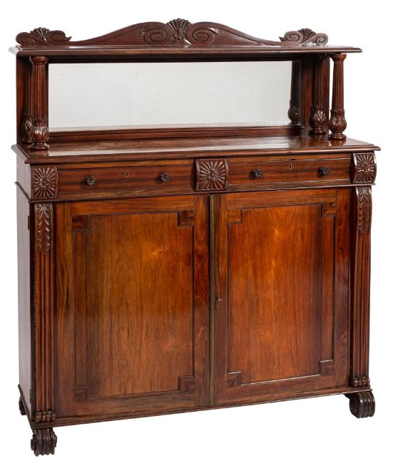 A George IV goncalo alves chiffonier, circa 1825; the back gallery carved with lobed cresting flanked by scrolling; above a shelf with ovolo edging, on reeded columnar supports; the mirror plate flanked by conforming pilasters; above two short drawers each with twin carved knob handles, interspersed by floral and lobed paterae; above twin panel doors flanked by conforming pilasters to scrolled feet; 137cm high, 120cm wide, 43cm deep