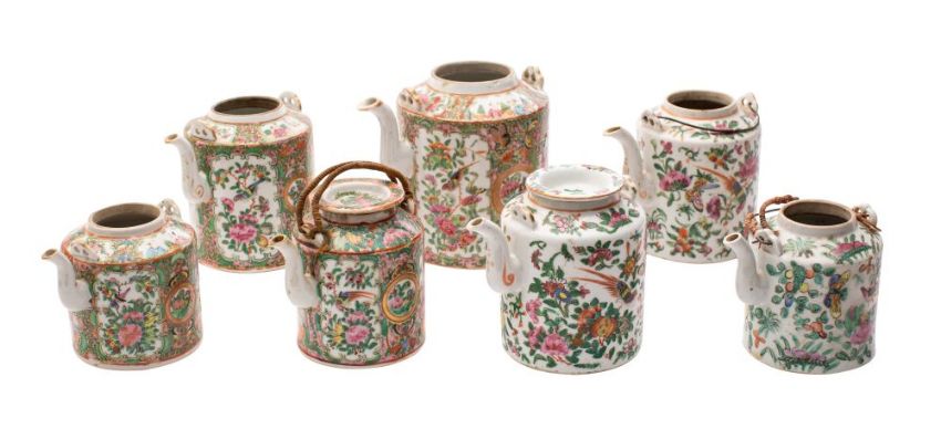 A group of seven Chinese Canton famille rose/verte teapots: of conventional cylindrical form and decorated with birds, insects, flowers and foliage, late Qing Dynasty, 11-14cm [four lacking covers, one with rim chips].