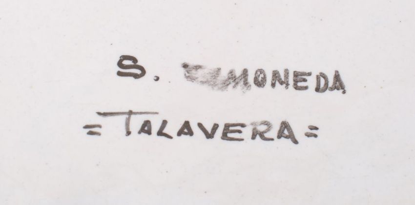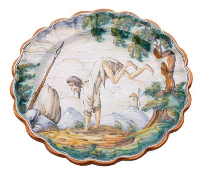A Talavera maiolica dish decorated with a leaping bearded man in a mountainous landscape, 20th century, 41cm.