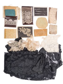 Queen Mary of Teck (1867-1953) and Shaldon Lace School.A collection of lace samples and manuscript correspondence between Reville & Roossite, Of Hanover Square, London and Miss Flora L Lucas of The Lace School Shaldon, Teignmouth regarding the making of the 1922 Coronation robes, comprising a framed group of lace motifs of St George & The Dragon, an angel, birds, butterflies and flowers, eight smaller sheets of similar lace motifs and a box of miscellaneous lace, together with a black and white photograph of King George V and Queen Mary in Coronation robes, a copy of Bigg-Wither, R. 'Cameos From a lace Cupboard' and a collection of manuscript correspondence.The correspondence reflects the anger caused to R&R by the Lace School for featuring in the national newspapers as 'Suppliers of Fine lace' in the making of the robes that Queen Mary was to wear during the coronation on 22nd June , 1911.'Our attention has been called to a notice in the newspapers that you are supplying laces for the Queen's coronation robes, This is, to say the least, premature and should certainly not have appeared without our consent , and we fear it will cause much annoyance to Her Majesty as the Queen very much objects to advertisement and it may cause serious loss to our business... Madame Rossiter is seriously considering cancelling the whole order'There are seven letters from R&R with a copy of a humble reply on the 15th January suggesting that the source of the complaint may have been the children at the school. There are several letters from a lady in waiting on Windsor Castle headed paper which still have their postally stamped envelopes. Among other pieces of ephemera is a detailed hand written price list, with a rather charmingly posed group photograph of the school's teachers and pupils, with a partially complete list of those present. The spat seems to have subsided come April 3rd, Bertha Hawkins writes to R&R on Buckingham headed notepaper 'The Queen commands me to thank you very much indeed for so kindly letting her know about the Honiton sprigs: It is most interesting, but her majesty does not know what has become of Victoria's wedding lace and without it the sprigs would be of no use'Reville & Rossiter was a London Couture house who made gowns for Queen Mary.