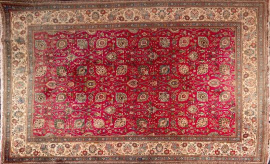 A Tabriz Carpet, the rose field with an all over design of scrolling palmettes and flowering foliage, enclosed by a main beige palmette meander border, 497cm x 337cm.
