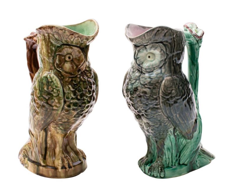 Two majolica ewers both modelled in the form of owls with flowering branch handles under green, brown and grey glazes, one with green interior the other with pink, late 19th century, 28cm high, [minor damage].