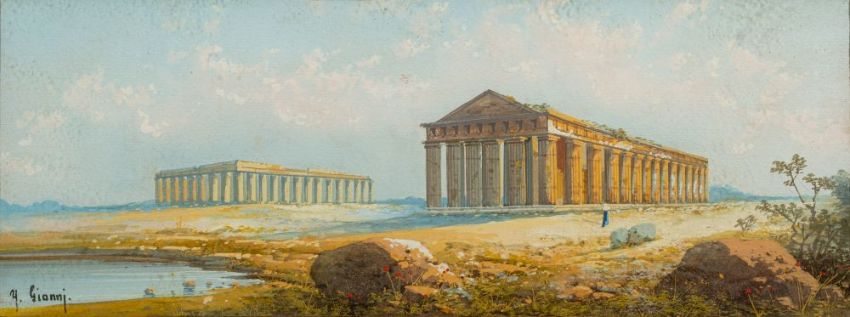 Yves Gianni (Italian, fl. late 19th/early 20th century)View of the Greek temples at Paestumsigned lower left, dated 1906 to reversewatercolour and gouache on paper12 x 32cm.