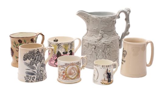 A mixed lot of commemorative ceramics comprising a Wedgwood Elizabeth II Coronation 1953 mug designed by Eric Ravilious, 10cm [restored]; a small Bridgwood mug with prints of 'The Saucy Arethusa/Britain's Sure Shield/Every Man Will Do His Duty', early 20th century, 7cm; a Victoria 1837-1897 Jubilee mug, 8cm; a large 19th century Masons Patent Ironstone relief moulded jug, 23cm; a Royal Doulton Elizabeth R 1953 Coronation mug, 13cm; a John Tams Crown Pottery pint mug, 12cm; and a 19th century relief moulded jug [restored] 7.
