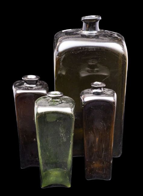 Four mould blown Dutch gin bottles of shouldered square profile with raised everted neck, early/mid 19th century, tallest 37cm high.