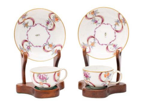 A pair of Zurich teacups and saucers, each painted with floral sprays amongst puce ribbons around a central foliate cartouche, underglaze blue Z marks, circa 1780, saucers 13.5cm.