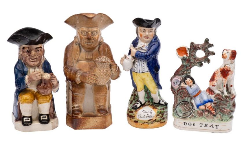 Three Toby jugs and a Staffordshire group, comprising a salt glazed toper seated with a foaming jug of ale, a similarly modelled toby jug and cover under polychrome glazes and a later Hearty Good Fellow, the Staffordshire group captioned 'Dog Tray', tallest toby 30cm high, [some loss and damage].