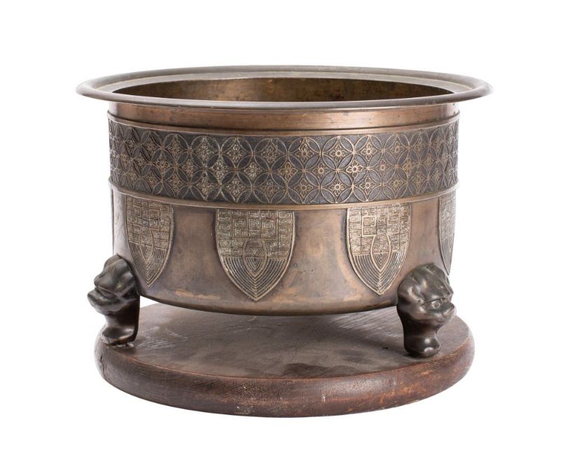 A Chinese bronze jardiniere of circular outline with banded trellis decoration with suspended shields with geometric decoration, raised on three lion paw feet, mounted on a wood stand, 28cm diameter.