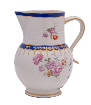 A Derby jug of 'Price' shape with scroll handle and reeded neck, painted in the manner of Edward Withers with floral sprays between blue and gilt borders, circa 1780-90, 18cm [star crack to base, some wear to gilt].