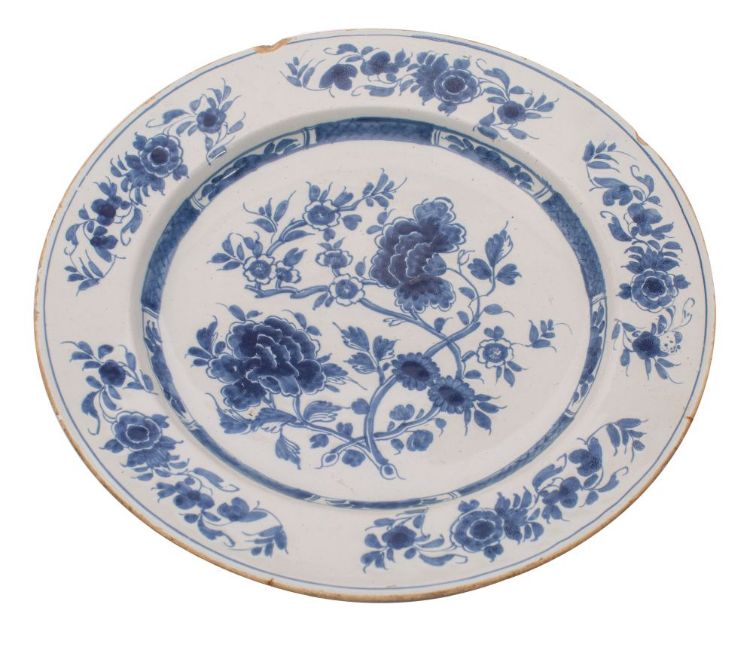 A Dutch delft charger, painted in blue with peony and prunus with further blooms on the border, 35cm diameter, late 18th century, [small rim chip]