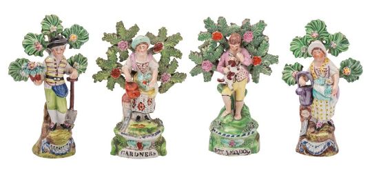 A matched pair of Salt pottery figures titled 'Boy and Dog' and 'Gardeners' and a similar pair of gardeners: all with bocage backgrounds and on raised mound bases, circa 1810-20, 14-15cm [minor damage and restoration].