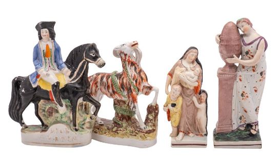 A group of four Staffordshire pottery figures comprising two early 19th century pearlware square based figures of Charity and Andromache Weeping over the Ashes of Hector, 18 and 23cm; and two Victorian figures of a goat and serpent and Dick Turpin, 19 and 22cm [some damage].